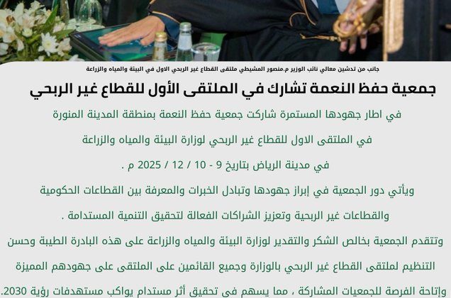 شارك #المجلس_التخصصي_لجمعيات_حفظ_النعمة في #الملتقى_الأول_للقطاع_غير_الربحي الذي تنظمه وزارة البيئة والمياه والزراعة، وذلك تعزيزًا للتكامل، وتبادل الخبرات، ودعم المبادرات النوعية ذات الأثر المستدام في القطاع.