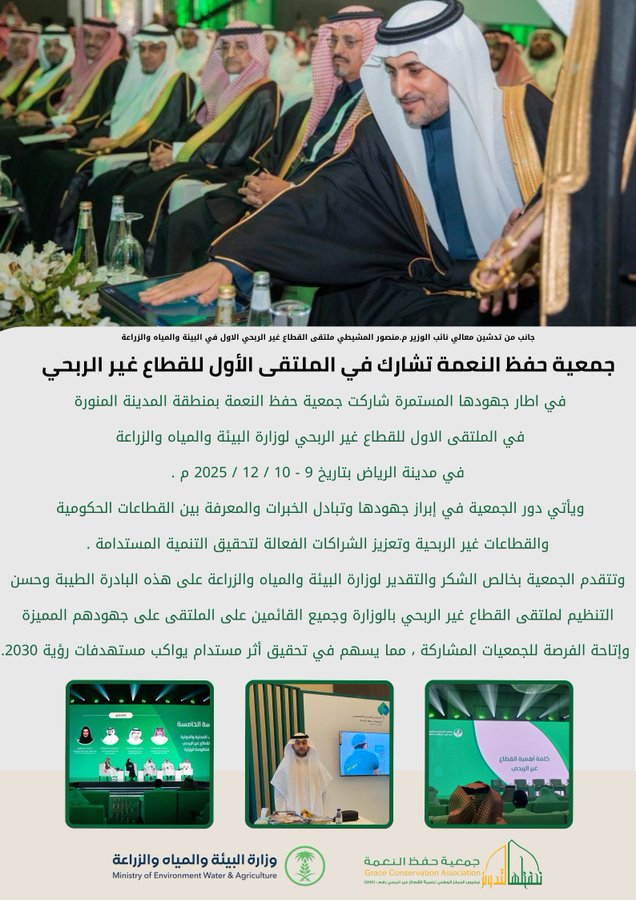 شارك #المجلس_التخصصي_لجمعيات_حفظ_النعمة في #الملتقى_الأول_للقطاع_غير_الربحي الذي تنظمه وزارة البيئة والمياه والزراعة، وذلك تعزيزًا للتكامل، وتبادل الخبرات، ودعم المبادرات النوعية ذات الأثر المستدام في القطاع.